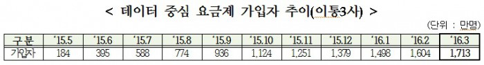 17일 한국통신사업자연합회(KTOA)에 따르면 2016년 3월 기준 국내 데이터중심요금제 가입자는 1730만명에 이른다.