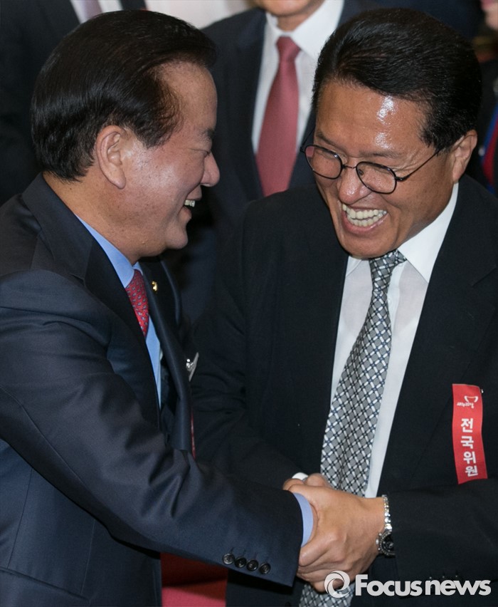 (서울=포커스뉴스) 17일 오후 서울 여의도 국회 의원회관에서 비대위 구성안 및 당헌 당규개정안 등 현안 처리를 위해 예정된 4차 새누리당 전국위원회에 참석한 정갑윤(왼쪽) 국회 부의장과 정운천 당선인이 인사하고 있다. 이날 전국위원회의는 앞서 예정된 상임전국위원회를 개최해 당헌개정안 등을 심의할 예정이었지만, 친박계 의원들이 대거 불참해 참석자 미달로 회의가 열리지 못 했다.