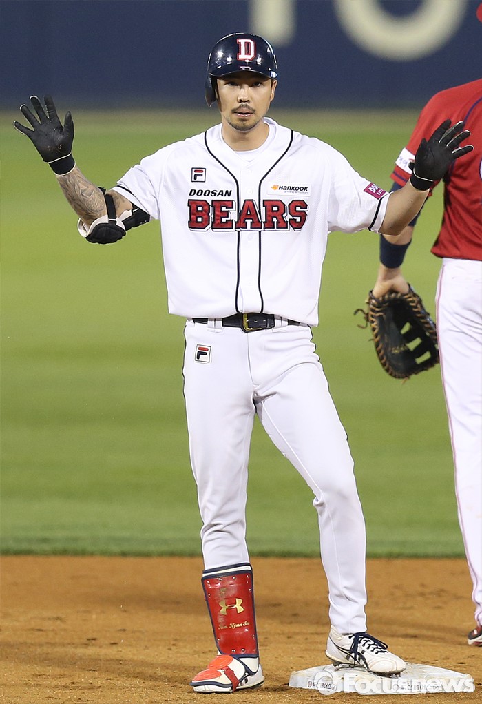 (서울=포커스뉴스) 17일 서울 잠실구장에서 열린 2016프로야구 KIA-두산 경기에서 두산 오재원이 5회말 1사후 중견수를 넘기는 2루타를 치고 2루에서 심판에게 타임을 요청하고 있다.