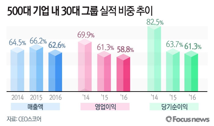 (서울=포커스뉴스) 500대 기업에 속한 30대 그룹 매출과 당기순이익 비중은 60%대 턱걸이로 2년 전에 비해 하강했다. 영업이익 비중은 50%대로 떨어졌다. 재벌그룹들의 중공업 수출 업종 기업들의 실적이 악화된 탓이다.