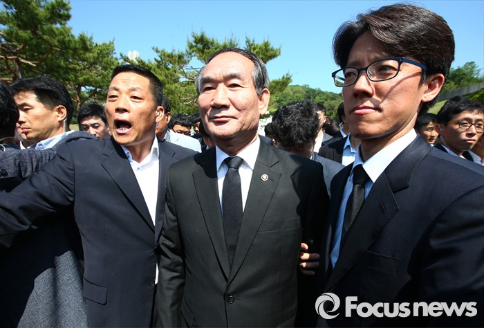 (광주=포커스뉴스) 36주년 5·18민주화운동 기념식이 거행된 18일 오전 광주 북구 운정동 5·18민주묘지에서 행사장에 참석하려는 박승춘 보훈처장이 5월 유가족의 항의를 받고 기념식장을 떠나고 있다.