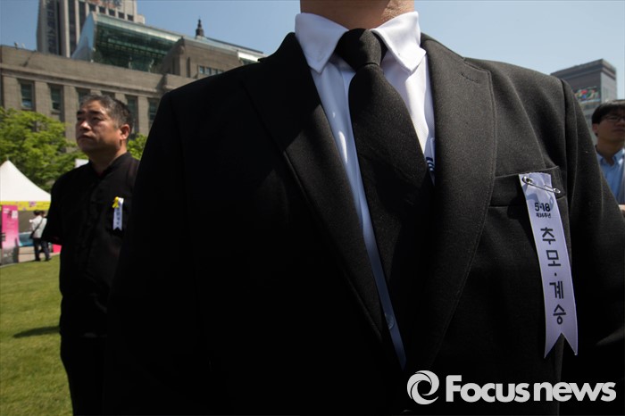 (서울=포커스뉴스) 18일 오전 서울 중구 서울시청 앞 광장에서 열린 5.18 민주화운동 기념식에 참석한 시민들의 가슴에 '추모, 계승' 이라 적힌 리본이 달려 있다.