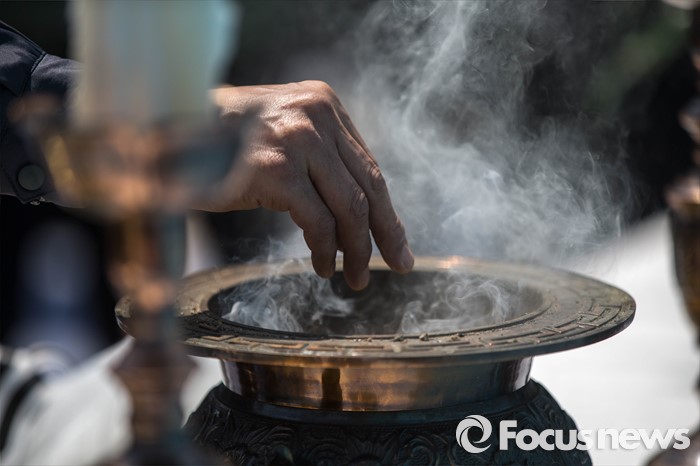 (서울=포커스뉴스) 18일 오전 서울 중구 서울시청 앞 광장에서 열린 5.18 민주화운동 기념식에 참석한 한 시민이 단상에 올라 헌화 후 분향을 하고 있다.
