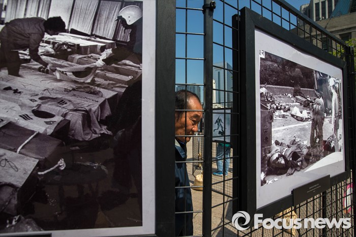 (서울=포커스뉴스) 18일 오전 서울 중구 서울시청 앞 광장에서 5.18 민주화운동 기념식이 열린 가운데 한 시민이 5.18 당시의 사진을 바라보고 있다.