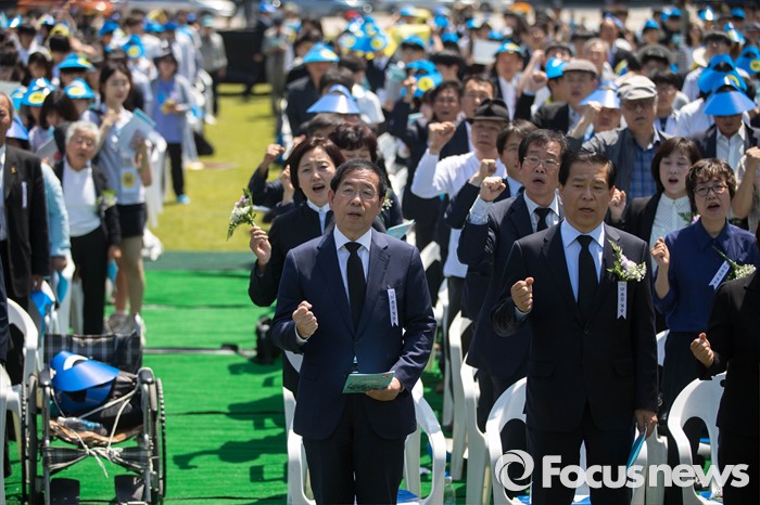(서울=포커스뉴스) 18일 오전 서울 중구 서울시청 앞 광장에서 열린 5.18 민주화운동 기념식에 참석한 박원순 서울시장이 임을 위한 행진곡을 부르고 있다.