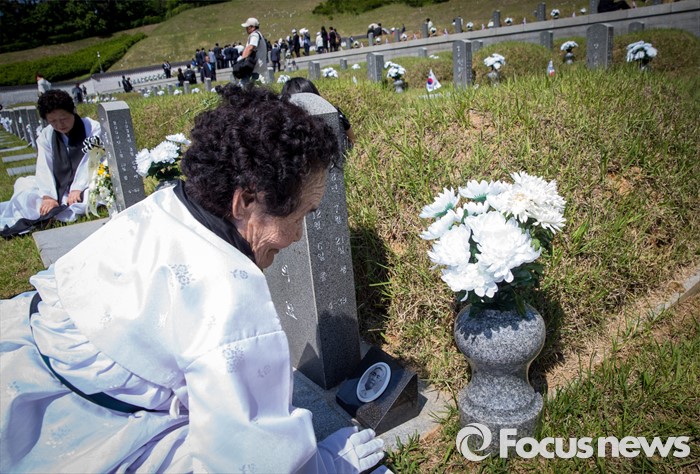 (광주=포커스뉴스) 36주년 5·18민주화운동 기념식이 거행된 18일 오전 광주 북구 운정동 5·18민주묘지에서 유가족들이 묘비를 지키고 있다.