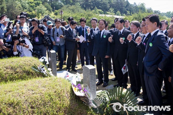 당광주=포커스뉴스) 36주년 5·18민주화운동 기념식이 거행된 18일 오전 광주 북구 운정동 5·18민주묘지에서 안철수 상임공동대표, 박지원 원내대표를 비롯한 국민의당 의원 당선자들이 임을 위한 행진곡을 부르고 있다.