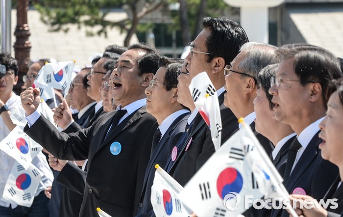 (광주=포커스뉴스) 36주년 5·18민주화운동 기념식이 거행된 18일 오전 광주 북구 운정동 5·18민주묘지에서 황교안 국무총리를 제외한 여야 지도부와 참석자들이 '임을 위한 행진곡'을 부르고 있다.