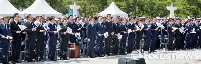 (광주=포커스뉴스) 36주년 5·18민주화운동 기념식이 거행된 18일 오전 광주 북구 운정동 5·18민주묘지에서 황교안 국무총리를 제외한 여야 지도부와 참석자들이 '임을 위한 행진곡'을 부르고 있다.