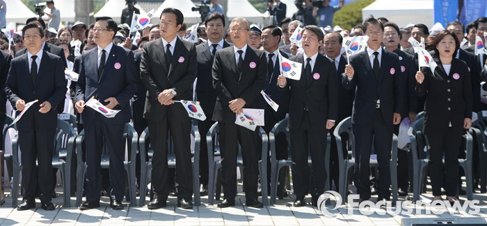 (광주=포커스뉴스) 36주년 5·18민주화운동 기념식이 거행된 18일 오전 광주 북구 운정동 5·18민주묘지에서 황교안 국무총리를 제외한 여야 지도부와 참석자들이 '임을 위한 행진곡'을 부르고 있다.