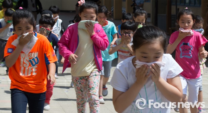 (공주=포커스뉴스) 18일 오후 충남 공주 신월초등학교에서 2016 재난대응 안전한국훈련 일환으로 실시된 현장대응 훈련에서 가스폭발로 인한 화재 발생을 가정, 학생들이 대피훈련을 하고 있다.