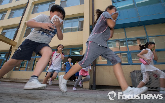 (공주=포커스뉴스) 18일 오후 충남 공주 신월초등학교에서 2016 재난대응 안전한국훈련 일환으로 실시된 현장대응 훈련에서 가스폭발로 인한 화재 발생을 가정, 학생들이 대피훈련을 하고 있다.