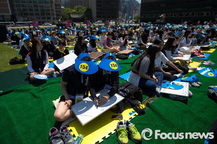 (서울=포커스뉴스) 18일 오후 서울 중구 서울시청 앞 광장에서 열린 '5.18 민주화운동 36주년 기념식 - 5.18 골든벨 행사'에 참석한 학생들이 퀴즈 문제를 풀고 있다.