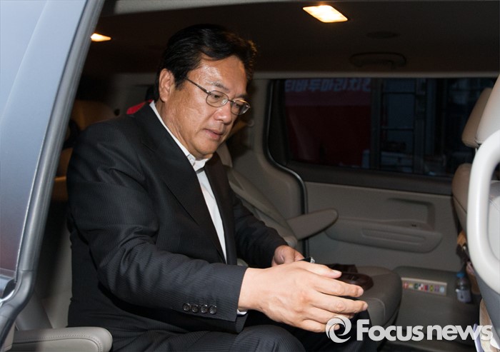 (공주=포커스뉴스) 정진석 새누리당 원내대표가 18일 오후 충남 공주 지난 선거 당시 사용했던 선거사무소에서 측근과 논의를 마치고 사무소를 나와 차량으로 이동하고 있다.
