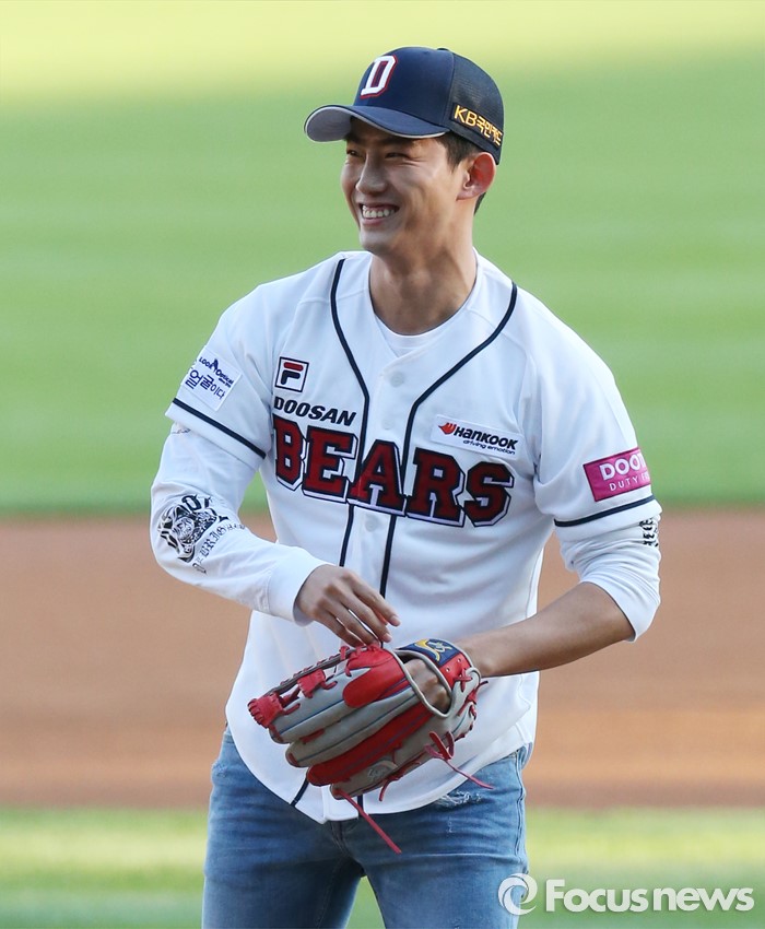(서울=포커스뉴스) 18일 서울 잠실구장에서 열린 2016프로야구 KIA-두산 경기에 앞서 가수 겸 연기자인 옥택연이 시구한 공이 엉뚱한 곳으로 가자 멋적은듯 웃고 있다.