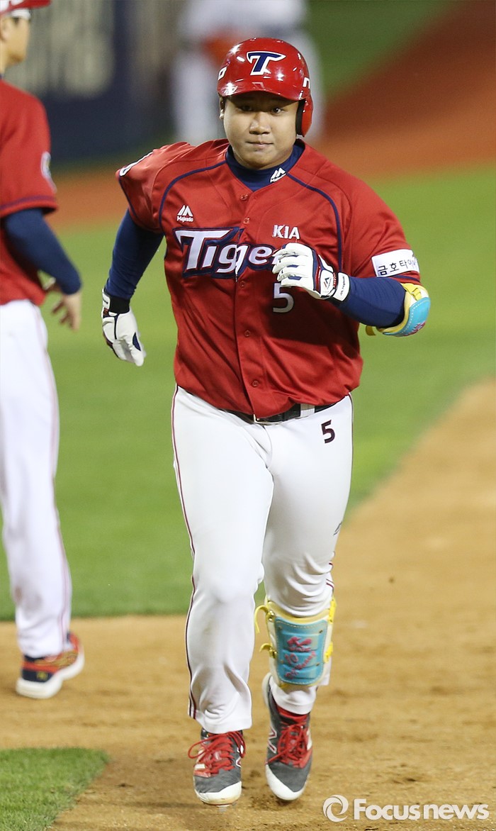 (서울=포커스뉴스) 18일 서울 잠실구장에서 열린 2016프로야구 KIA-두산 경기 5회초 KIA 황대인이 김주형에 이어 백투백으로 좌월 홈런을 치고 3루를 돌아 홈인하고 있다.