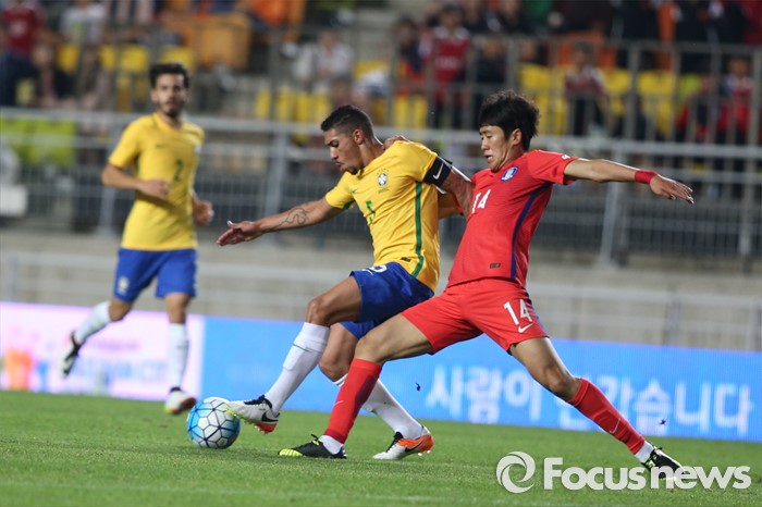 (수원=포커스뉴스) 18일 오후 경기도 수원시 수원월드컵경기장에서 열린 2016 수원 JS컵 U-19 국제청소년축구대회 대한민국과 브라질의 경기에서 원두재가 볼을 다투고 있다.