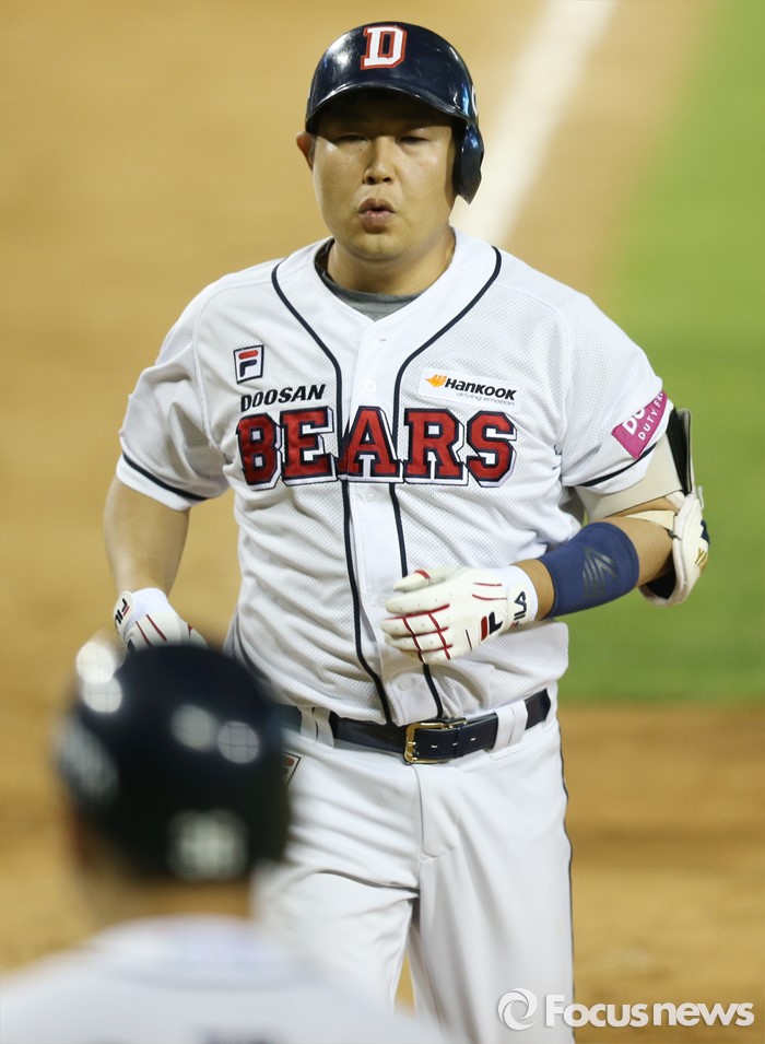(서울=포커스뉴스) 18일 서울 잠실구장에서 열린 2016프로야구 KIA-두산 경기 8회말 두산 선두타자 양의지가 좌월 1점 홈런을 치고 홈인하고 있다.