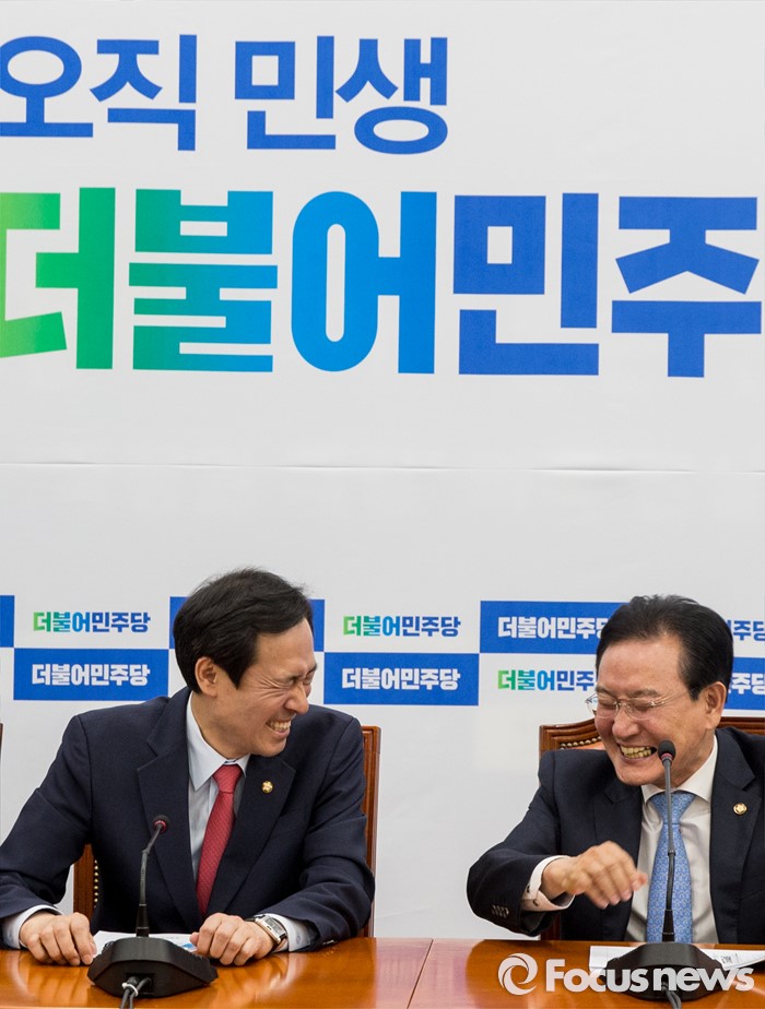 (서울=포커스뉴스) 19일 오전 여의도 국회에서 열린 더불어민주당 원내대표단 회의에 참석한 우상호(왼쪽) 원내대표, 변재일 정책위의장이 대화하고 있다.