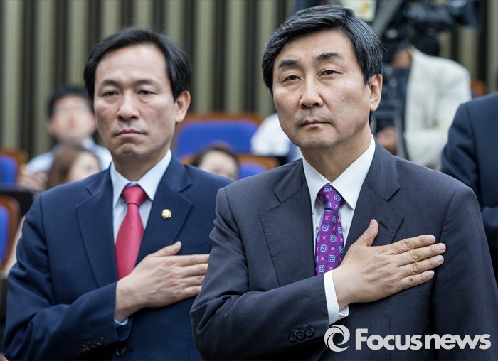(서울=포커스뉴스) 19일 오전 여의도 국회에서 열린 더불어민주당 의원총회에 참석한 우상호 신임 원내대표와 이종걸 전 원내대표가 국민의례 하고 있다.