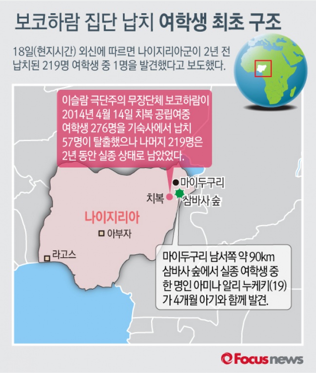 (서울=포커스뉴스) 18일(현지시간) 외신에 따르면 나이지리아군이 2년 전 보코하람에 납치된 219명 '치복 여학생' 중 한 명인 아미나 알리 누케키를 나이지리아 북동부 삼바사 숲에서 발견했다고 보도했다.