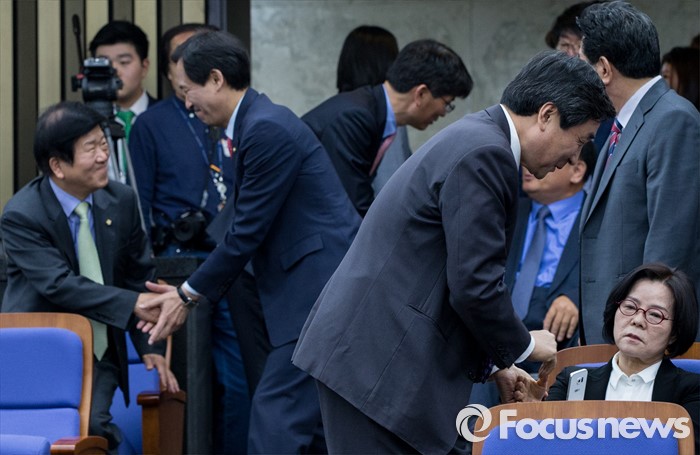 (서울=포커스뉴스) 19일 오전 여의도 국회에서 열린 더불어민주당 의원총회에 참석한 우상호 신임 원내대표와 이종걸 전 원내대표가 동료 의원들과 인사하고 있다.
