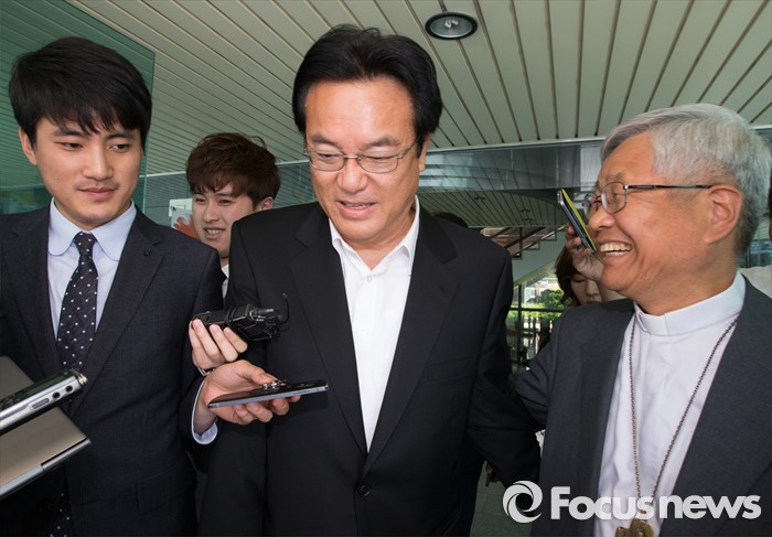 (대전=포커스뉴스) 정진석 새누리당 원내대표가 19일 오전 대전 동구 천주교 대전교구청을 찾아 유흥식 주교와 면담을 갖고 교구를 나서고 있다.