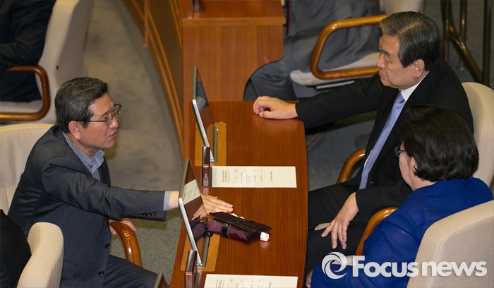 (서울=포커스뉴스) 19일 오전 서울 여의도 국회에서 열린 342회 국회(임시회) 1차 본회의에 참석한 김무성(오른쪽 위) 새누리당 전 대표와 김학용(왼쪽), 김을동 의원이 대화하고 있다.