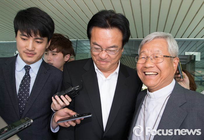 (대전=포커스뉴스) 정진석 새누리당 원내대표가 19일 오전 대전 동구 천주교 대전교구청을 찾아 유흥식 주교와 면담을 갖고 교구를 나서고 있다.