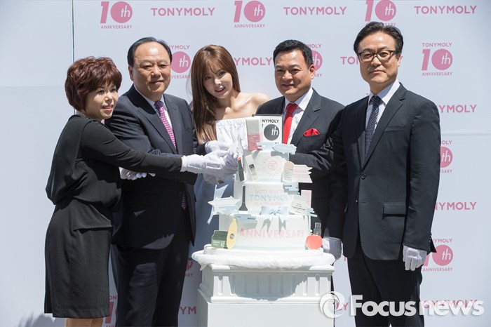(서울=포커스뉴스) 19일 오전 서울 종로구 아름지기에서 토니모리 10주년 기념행사 '뷰티 에비뉴' 에 참석한 가수 현아(가운데)와 임직원들이 포토타임을 갖고 있다. 왼쪽 두번째부터,배해동 토니모리 회장, 가수 현아, 양창수 토니모리 사장, 윤영로 토니모리 부사장