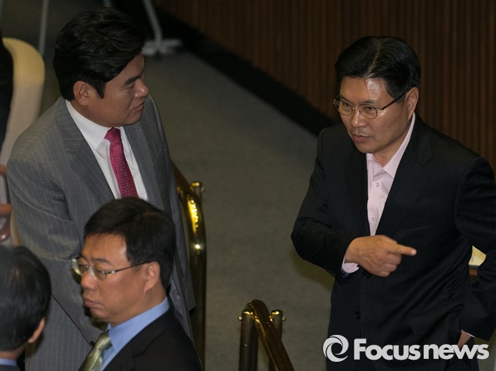 (서울=포커스뉴스) 19일 오전 서울 여의도 국회에서 열린 342회 국회(임시회) 1차 본회의에 참석한 원유철(왼쪽) 새누리당 전 원내대표와 홍문종 의원이 대화하고 있다.