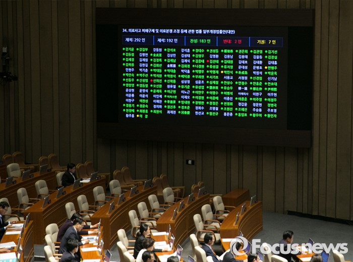 (서울=포커스뉴스) 19일 오전 서울 여의도 국회에서 열린 342회 국회(임시회) 1차 본회의에서 의료사고 피해구제 및 의료분쟁 조정 등에 관한 법률 일부개정법률안(대안)이 재석 192인 중 찬성 183인, 반대 2인, 기권 7인으로 통과되고 있다.