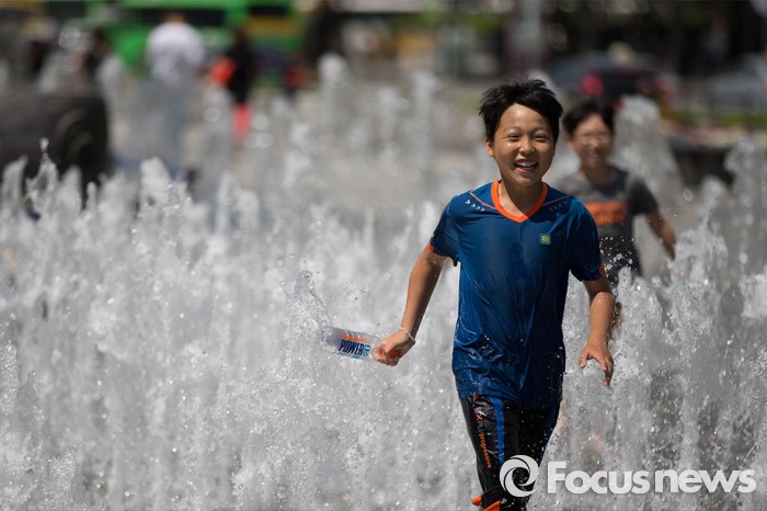 (서울=포커스뉴스) 서울의 낮 기온이 30도를 넘는 19일 오후 서울 광화문광장 분수대에서 아이들이 물놀이를 즐기고 있다.