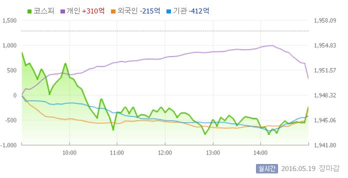 이날 코스피는 1950선에서 장을 시작했다. 이후 지수는 약보합권에서 등락을 반복했다. 특히 기관과 외국인의 동반 매도세가 지수 하락세를 이끌었다.