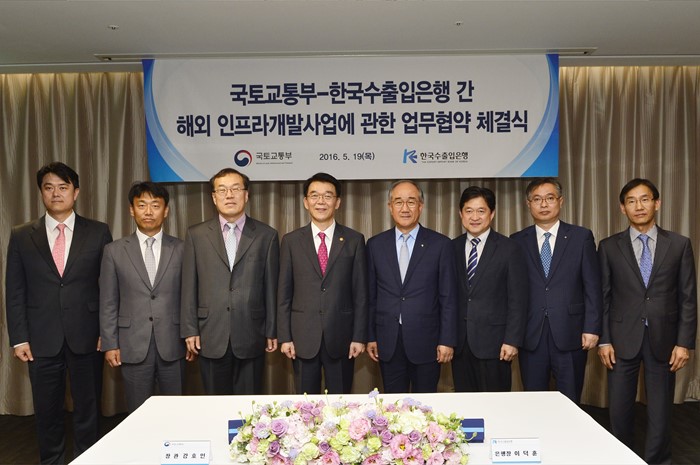 (서울=포커스뉴스) 강호인(왼쪽 네번째) 국토교통부 장관이 19일 서울 영등포구 여의도 글래드호텔에서 이덕훈 한국수출입은행장과 해외인프라개발사업에 관한 업무협약을 체결하고 기념촬영을 하고 있다. <사진제공=국토교통부>