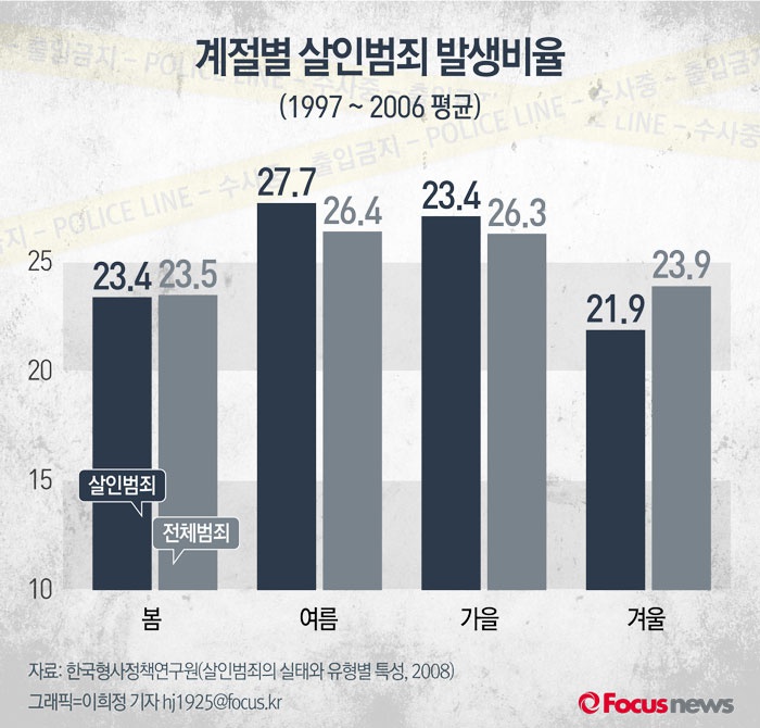 (서울=포커스뉴스) 한국형사정책연구원의 자료(살인범죄의 실태와 유형별 특성, 2008)에 따르면 1997년부터 2006년까지 10년 동안 여름에 살인 범죄율이 가장 높은 것으로 집계됐다. 여름철 살인 범죄율 분포는 27.7%로 계절별 전체 범죄율 분포 26.4%보다도 높은 수치다.
