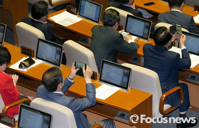 (서울=포커스뉴스) 19일 오후 서울 여의도 국회에서 열린 342회 국회(임시회) 1차 본회의에 참석한 의원들이 정의화 국회의장의 마무리 발언 모습 등을 촬영하고 있다.