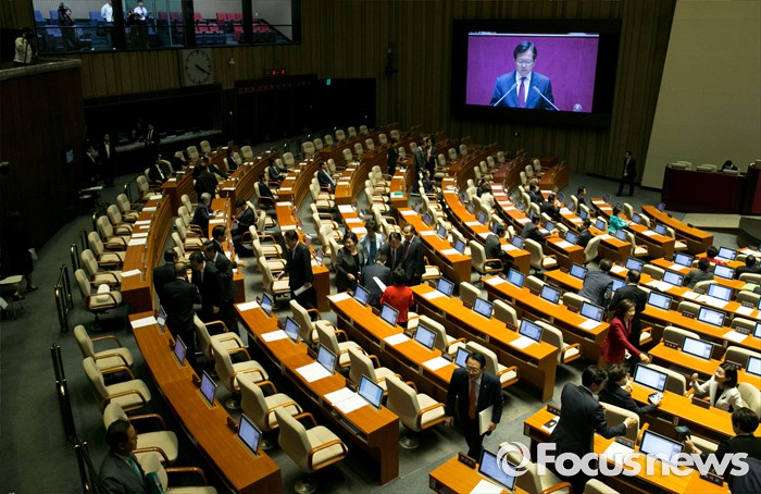 (서울=포커스뉴스) 19일 오후 서울 여의도 국회에서 열린 342회 국회(임시회) 1차 본회의에 참석한 의원들이 안건 의결 후 진행된 김기준 더불어민주당 의원의 5분 자유발언 중 퇴장하고 있다.