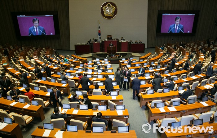 (서울=포커스뉴스) 19일 오후 서울 여의도 국회에서 열린 342회 국회(임시회) 1차 본회의에 참석한 의원들이 안건 의결 후 진행된 김기준 더불어민주당 의원의 5분 자유발언 중 퇴장하고 있다.
