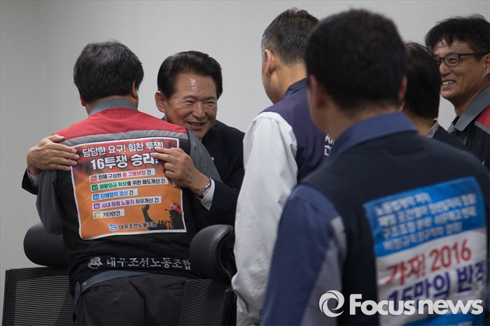 한편 이날 조선노연은 오전에 국회에서 '대량해고 반대, 조선업강화특별법 제정' 기자회견을 열고 △조선업계 구조조정 즉각 중단 △조선산업 발전 위한 정부정책 전환 △조선소 노동자 총고용 보장 및 사회 안전망 구축을 요구했다.(서울=포커스뉴스) 김한표 새누리당 의원이 19일 오후 서울 여의도 국회 의원회관에서 열린 '조선업종노조연대 대표자들과 각 정당 의원 간담회'에 참석해 조선업종노조연대 대표자들과 인사하고 있다. 2016.05.19 김흥구 기자