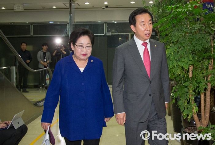 (서울=포커스뉴스) 19일 오후 서울 여의도 한 음식점에서 19대 국회 마지막 본회의를 마친 김을동(왼쪽) 새누리당 의원과 김성태 의원이 김무성 전 대표 주재로 열린 식사모임에 참석하고 있다.