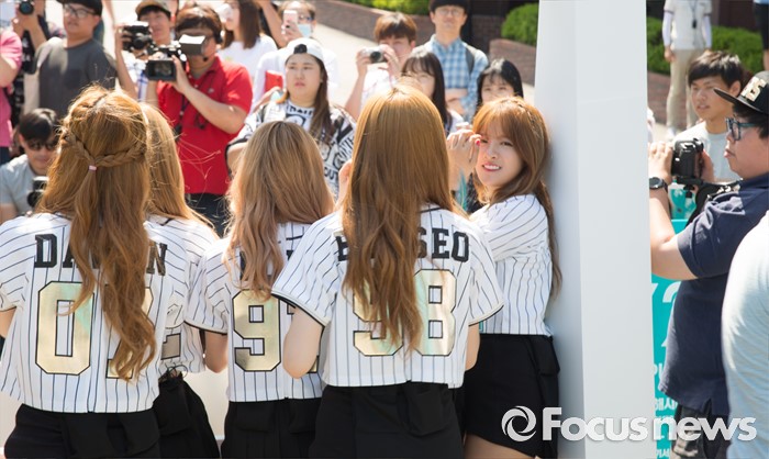 (서울=포커스뉴스) 19일 오후 서울 종로구 성균관대 캠퍼스에서 걸그룹 우주소녀의 멤버 엑시(오른쪽)가 'Y24 스쿨어택' 행사에 참여하고 있다.