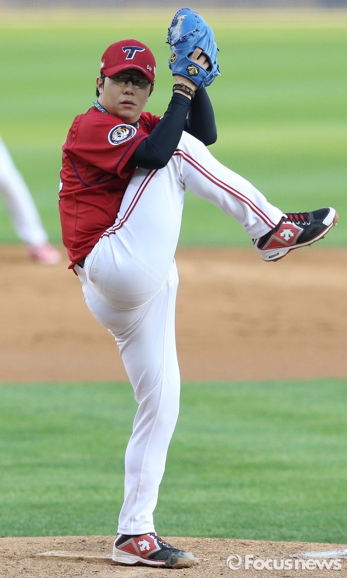 (서울=포커스뉴스) 19일 서울 잠실구장에서 열린 2016프로야구 KIA-두산 경기에서 1회말 KIA 선발투수 양현종이 오른쪽 무릎을 가슴까지 올리는 와인드업하며 투구하고 있다.