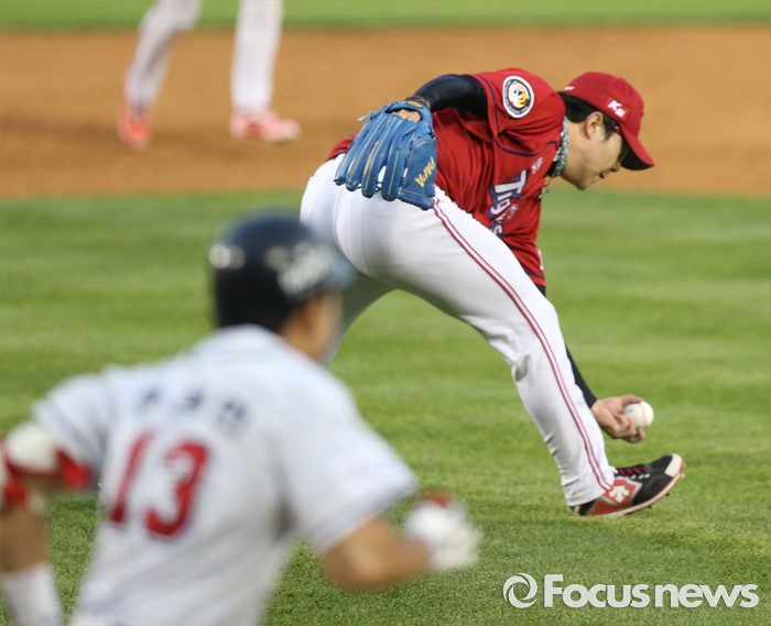 (서울=포커스뉴스) 19일 서울 잠실구장에서 열린 2016프로야구 KIA-두산 경기 2회말 2사후 KIA 투수 양현종이 두산 허경민의 투수앞 땅볼 타구를 잡고 있다.