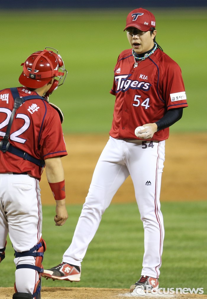 (서울=포커스뉴스) 19일 서울 잠실구장에서 열린 2016프로야구 KIA-두산 경기 4회말 1사 2루에서 KIA 투수 양현종이 동점 주자를 내보내자 포수 백용환이 마운드에 올라가며 대화하고 있다.