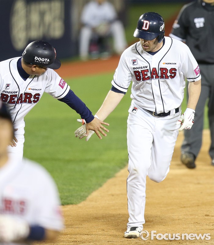 (서울=포커스뉴스) 19일 서울 잠실구장에서 열린 2016프로야구 KIA-두산 경기 5회말 2사 1루에서 두산 에반스가 좌월 2점 홈런을 치고 3루에서 전형도 3루 코치와 로우파이브를 하고 있다.