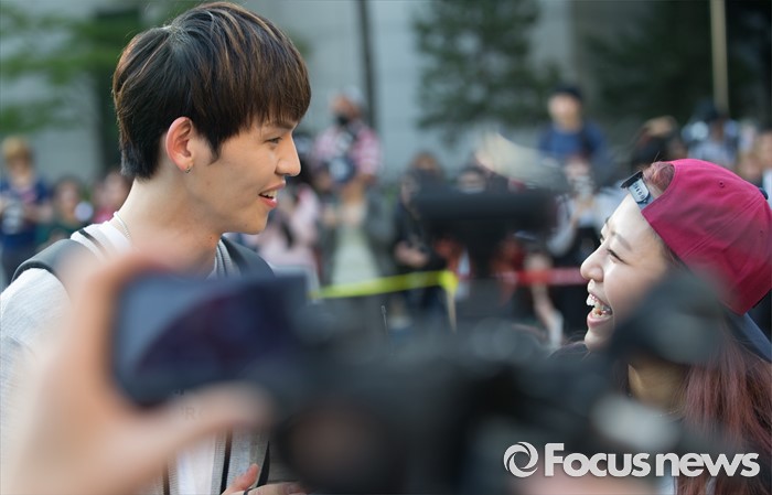 (서울=포커스뉴스) 20일 오전 서울 영등포구 KBS에서 아이돌 그룹 업텐션의 멤버 쿤이 생방송 뮤직뱅크 리허설에 참여하기 위해 이동하던 중 인터뷰를 하고 있다.