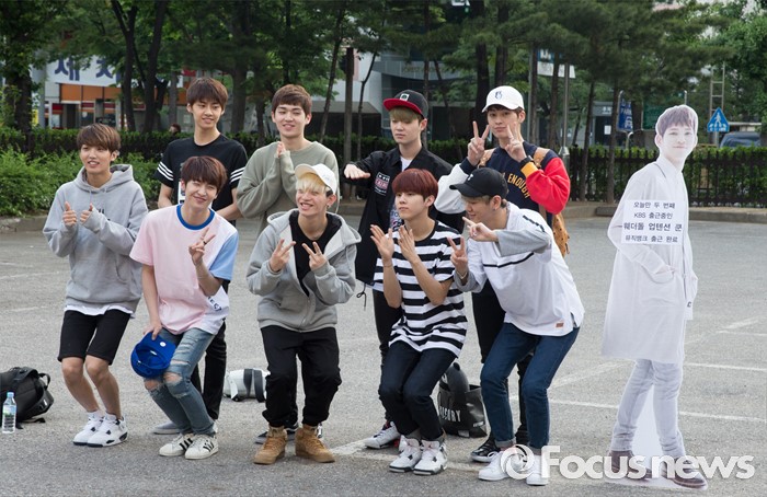 (서울=포커스뉴스) 20일 오전 서울 영등포구 KBS에서 아이돌그룹 업텐션이 생방송 뮤직뱅크 리허설에 참여하기 위해 이동하던중 포토타임을 갖고 있다.