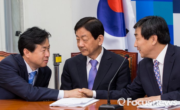 (서울=포커스뉴스) 20일 오전 서울 여의도 국회에서 열린 더불어민주당 비상대책위원회의에 참석한 이종걸(오른쪽) 전 원내대표가 김영춘(왼쪽) 비대위원과 악수하고 있다.