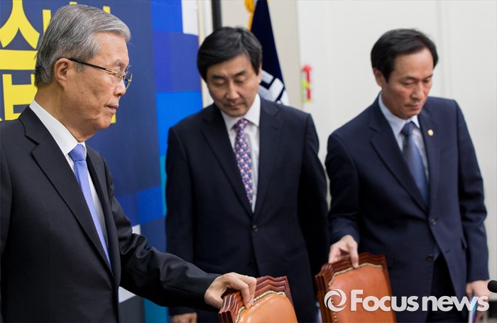 (서울=포커스뉴스) 20일 오전 서울 여의도 국회에서 열린 더불어민주당 비상대책위원회의에 김종인(왼쪽부터) 비대위 대표와 이종걸 전 원내대표, 우상호 원내대표가 참석하고 있다.